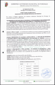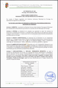 LEY MUNICIPAL DE DECLARATORIA DE EMERGENCIA MUNICIPAL POR INUNDACIONES EN EL MUNICIPIO DE PORONGO