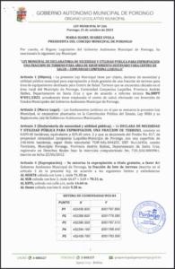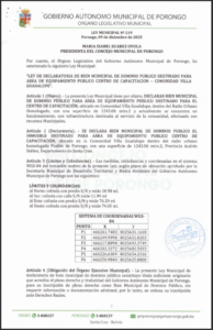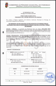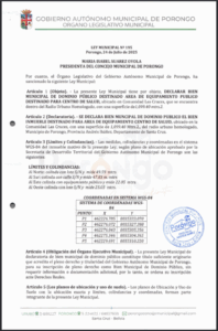 LEY MUNICIPAL DE DECLARATORIA DE BIEN MUNICIPAL DE DOMINIO PÚBLICO DESTINADO PARA AREA DE EQUIPAMIENTO PÚBLICO CASA DE LA CULTURA - PUEBLO DE PORONGO