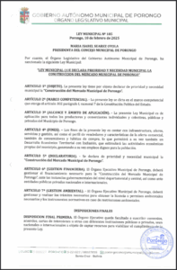 LEY MUNICIPAL QUE DECLARA PRIORIDAD Y NECESIDAD MUNICIPAL LA CONSTRUCCION DEL MERCADO MUNICIPAL DE PORONGO