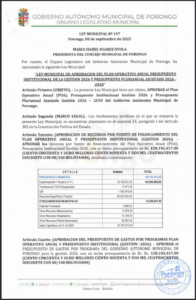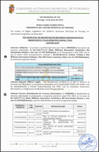 LEY MUNICIPAL DE INSCRIPCION DE RECURSOS ADICIONALES EN EL PRESUPUESTO INSTITUCIONAL 2025 DEL GOBIERNO AUTONOMO MUNICIPAL DE PORONGO
