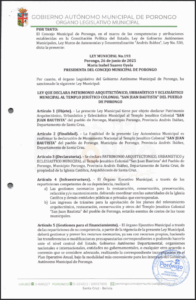 LEY MUNICIPAL QUE DECLARA PATRIMONIO ARQUITECTÓNICO, URBANÍSTICO Y ECLESIÁSTICO MUNICIPAL AL TEMPLO JESUÍTICO COLONIAL "SAN JUAN BAUTISTA" DEL PUEBLO DE PORONGO