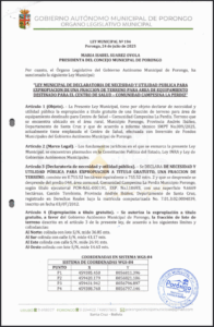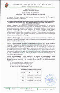 LEY MUNICIPAL DE DECLARATORIA DE NECESIDAD Y UTILIDAD PUBLICA PARA EXPROPIACION UNA FRACCION DE TERRENO PARA AREA DE EQUIPAMIENTO DESTINADO PARA PLAZA PRINCIPAL - COMUNIDAD AGUA DULCE
