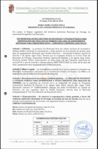 LEY MUNICIPAL DE DECLARATORIA DE NECESIDAD Y UTILIDAD PUBLICA PARA EXPROPIACION UNA FRACCION DE TERRENO PARA AREA DE EQUIPAMIENTO DESTINADO PARA UNIDAD EDUCATIVA - COMUNIDAD CAMPESINA AGUA DULCE