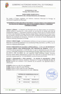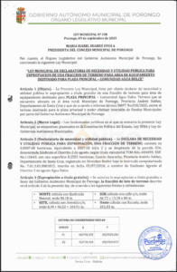 LEY MUNICIPAL DE DECLARATORIA DE NECESIDAD Y UTILIDAD PUBLICA PARA EXPROPIACION UN FRACCION DE TERRENO PARA AREA DE EQUIPAMIENTO PUBLICO 1 - COMUNIDAD CAMPESINA LA PERDIZ