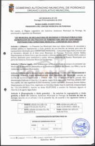 LEY MUNICIPAL DE DECLARATORIA DE NECESIDAD Y UTILIDAD PUBLICA PARA EXPROPIACION UNA FRACCION DE TERRENO PARA AREA DE EQUIPAMIENTO DESTINADO PARA CEMENTERIO MUNICIPAL - COMUNIDAD AGUA DULCE
