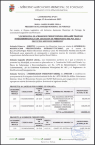 LEY MUNICIPAL DE MODIFICACIÓN PRESUPUESTARIA INTRAINSTITUCIONAL PARA ASIGNACION DE PRESUPUESTO DEL POA 2025 A PROYECTOS DE CONTINUIDAD Y PROYECTOS NUEVOS DE INVERSION