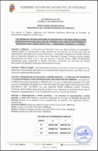 LEY MUNICIPAL DE DECLARATORIA DE NECESIDAD Y UTILIDAD PUBLICA PARA EXPROPIACION DE UNA FRACCION DE TERRENO PARA AREA DE EQUIPAMIENTO DESTINADO PARA UNIDAD EDUCATIVA - COMUNIDAD CAMPESINA LA PERDIZ