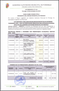 LEY MUNICIPAL PARA CREACION DE NUEVOS PROYECTOS DE INVERSION PLURIANUAL 2025 - 2026 CON MODIFICACION PRESUPUESTARIA INTRAINSTITUCIONAL EN EL POA DEL GOBIERNO AUTONOMO MUNICIPAL DE PORONGO