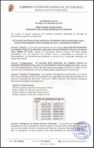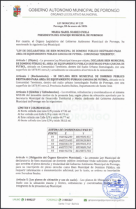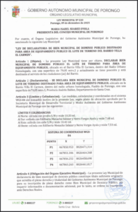 LEY DE DECLARATORIA DE BIEN MUNICIPAL DE DOMINIO PÚBLICO DESTINADO A EQUIPAMIENTO PARA "UNIDAD EDUCATIVA VIRGILIO JORDAN" DEL PUEBLO DE PORONGO
