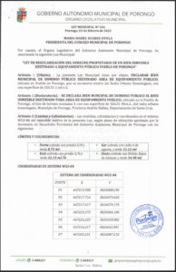 LEY DE REGULARIZACION DE DERECHO PROPIETARIO DE UN BIEN INMUEBLE DESTINADO A EQUIPAMIENTO PUBLICO PUEBLO DE PORONGO